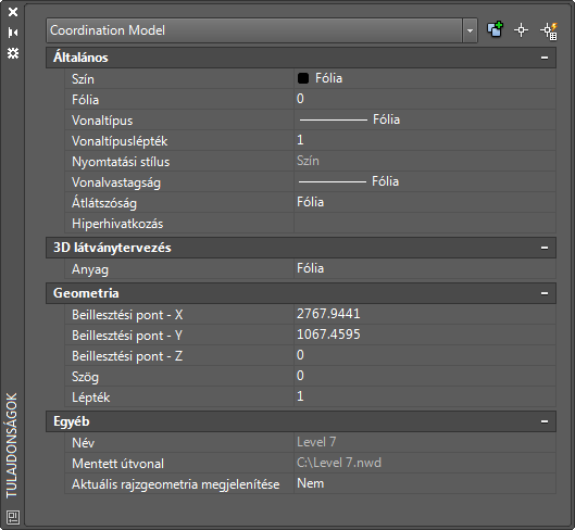 A Tulajdonságok paletta megjelenítéséhez kattintson duplán a koordinációs modellre vagy a modell körüli befoglaló téglatestre.