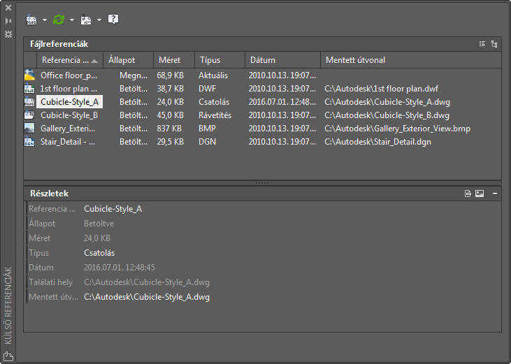 A Külső referenciák paletta rendszerezi, megjeleníti és kezeli a hivatkozott fájlokat, például a DWG-fájlokat (xrefeket), a DWF-, DWFx-, DGN- és PDF-alávetítéseket, a raszterképeket, a pontfelhőket (RCP- és RCS-fájlokat) és a koordinációs modelleket (NWD- és NWC-fájlokat).