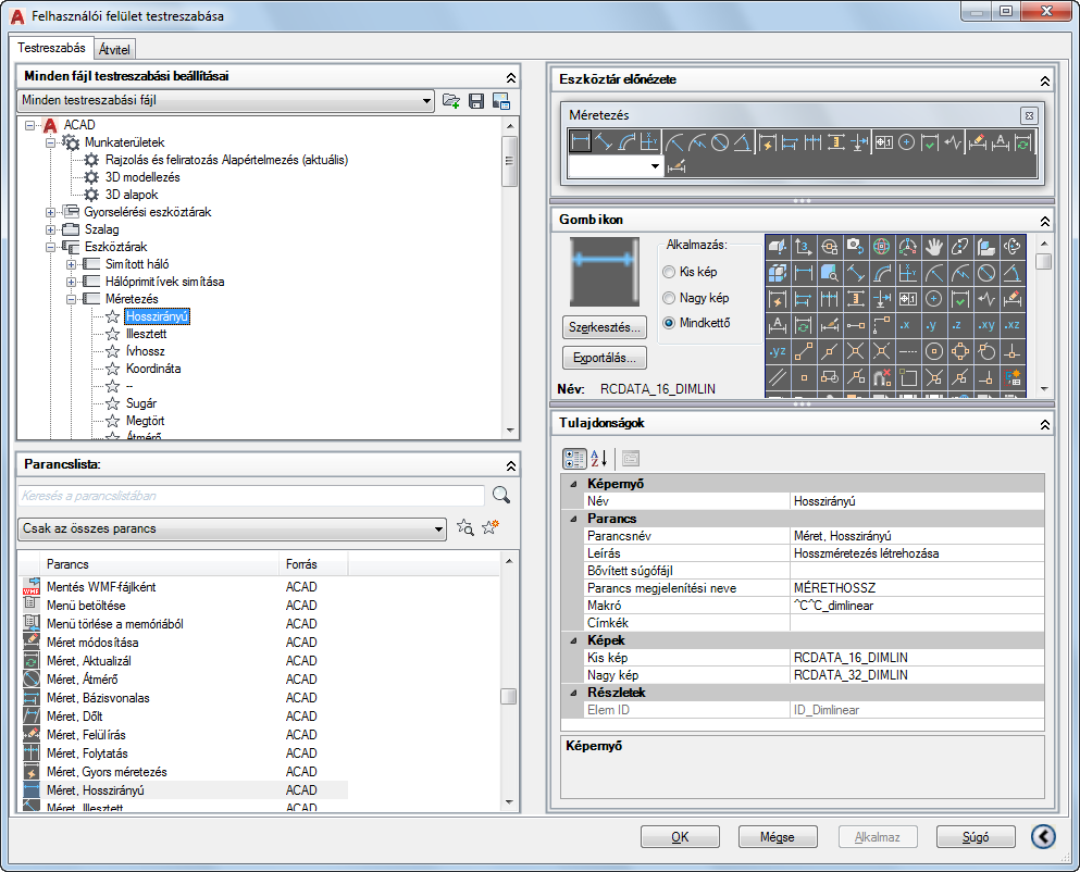 Megjegyzés: Amikor a Felhasználói felület testreszabása szerkesztőt az Eszközpaletta ablak Parancsok testreszabása opciójának vagy a Gyorselérési eszköztár vagy egy eszköztár Testreszabás opciójának segítségével jeleníti meg, a <fájlnév> testreszabási beállításai panel összecsukódik, és a Parancslista panel jelenik meg.
