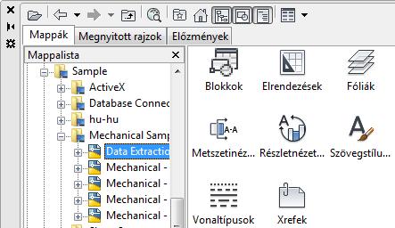 A Mappák, a Megnyitott rajzok és az Előzmények lapok többféle módot kínálnak a tartalmak elérésére.