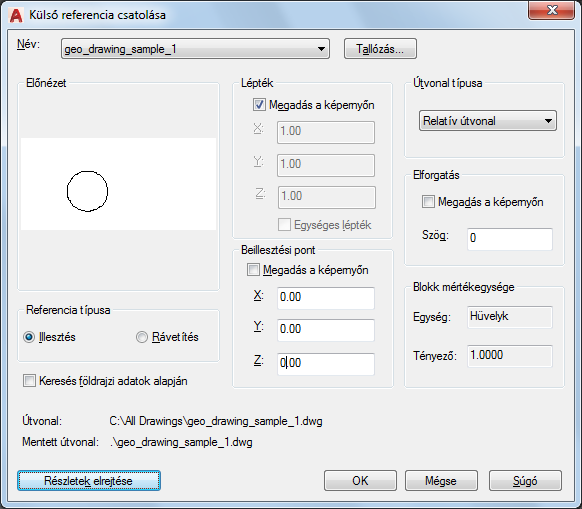 Megjeleníti azt az útvonalat, amely mentődik a rajzzal a külső referencia fájl csatolásakor. Az útvonal az Útvonal típusa beállítástól függ.