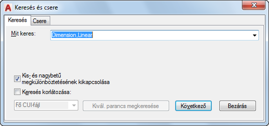 Megkeres minden parancsot vagy parancstulajdonságot írásmódjuktól függetlenül (például a parancs a VONAL és vonal parancsot is megtalálja).