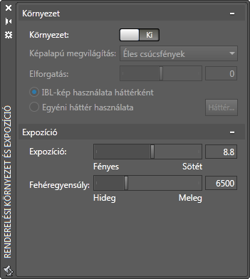 A Renderelési környezet és expozíció paletta a jelenetek globális megvilágításának beállításához használható.
