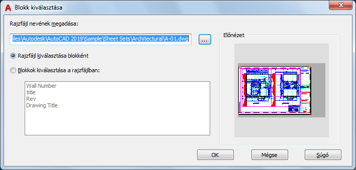 A megadott rajzfájlból vagy rajzsablon fájlból használja a kiválasztott blokkdefiníciót.