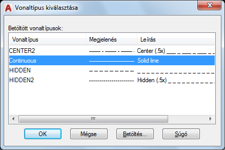 Megjeleníti az aktuális rajzba betöltött vonaltípusok listáját.