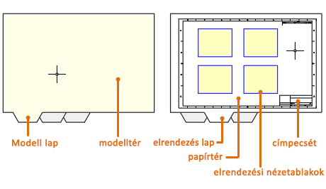 Az elrendezéseken belüli terület az úgynevezett papírtér, ahol címpecsétet adhat hozzá, megjelenítheti a modelltér léptékezett nézeteit az elrendezési nézetablakokon belül, és táblázatokat, konszignációkat, megjegyzéseket és méreteket hozhat létre a rajzhoz.