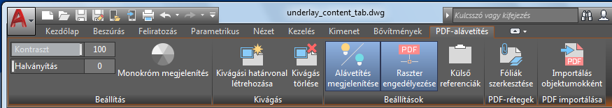 Amikor kiválaszt egy PDF-alávetítést, a szalagon megjelenik a PDF környezetfüggő lap.
