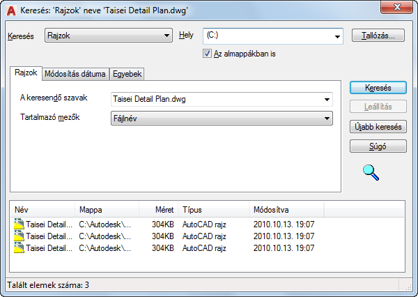 Megadja a keresendő tartalom típusát. A megadott tartalomtípus határozza meg, hogy a Keresés párbeszédpanel milyen lapjai és milyen keresési mezői jelennek meg. A Módosítás dátuma és az Egyebek lap csak akkor jelenik meg, ha a Keresés listában a Rajzok opció választotta.
