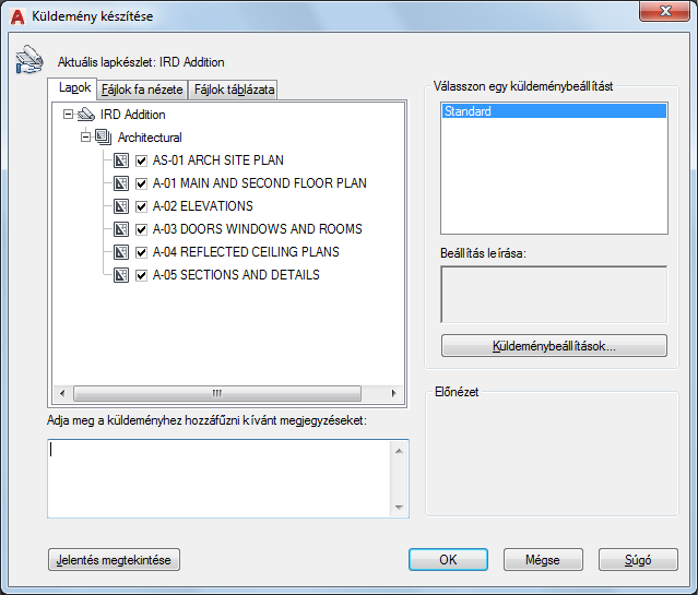 Jelentésinformációt jelenít meg, amely belekerül a küldeménycsomagba. Magában foglal minden beírt küldemény-megjegyzést, és tartalmazza azokat a program által automatikusan létrehozott disztribúciós megjegyzéseket, amelyek részletezik, hogy milyen lépések szükségesek a küldeménycsomag tökéletes működéséhez. Ha például SHX betűtípusok találhatók egy küldött rajzban, megjelenik egy útmutató arról, hova kell másolnia ezeket a fájlokat ahhoz, hogy azok a küldeményt telepítő számítógépen észlelhetők legyenek. Ha készült alapértelmezett megjegyzéseket tartalmazó szövegfájl, akkor a jelentés ezeket is tartalmazza.
