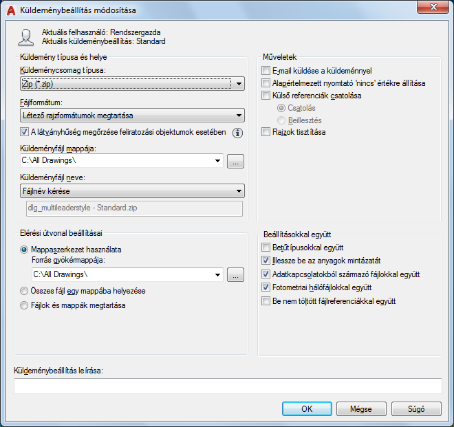 Ha nem módosítja ezt a mezőt, akkor a küldeményfájl az elsőnek megadott rajzfájlt tartalmazó mappában került létrehozásra. Lapkészlet-környezetben a küldeményfájl a lapkészletadat (DST) -fájlt tartalmazó mappában kerül létrehozásra. (Az AutoCAD LT programban nem alkalmazható.)