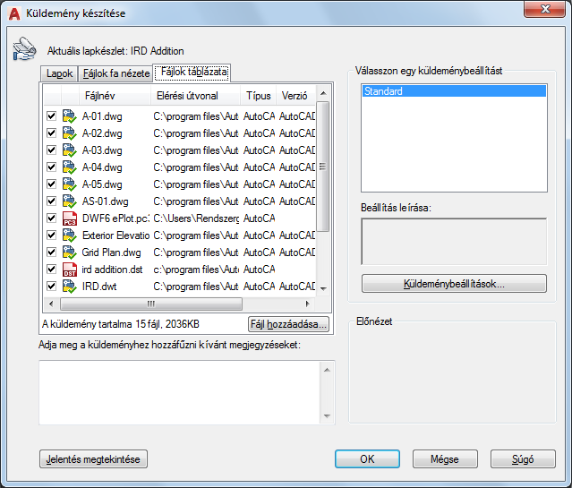 Jelentésinformációt jelenít meg, amely belekerül a küldeménycsomagba. Magában foglal minden beírt küldemény-megjegyzést, és tartalmazza azokat a program által automatikusan létrehozott disztribúciós megjegyzéseket, amelyek részletezik, hogy milyen lépések szükségesek a küldeménycsomag tökéletes működéséhez. Ha például SHX betűtípusok találhatók egy küldött rajzban, megjelenik egy útmutató arról, hova kell másolnia ezeket a fájlokat ahhoz, hogy azok a küldeményt telepítő számítógépen észlelhetők legyenek. Ha készült alapértelmezett megjegyzéseket tartalmazó szövegfájl, akkor a jelentés ezeket is tartalmazza.