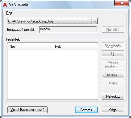 Megjeleníti a VBA-projekt megnyitása párbeszédpanelt (lásd VBABETÖLT), ahol betölthet egy létező projektet az aktuális munkaszakaszba.
