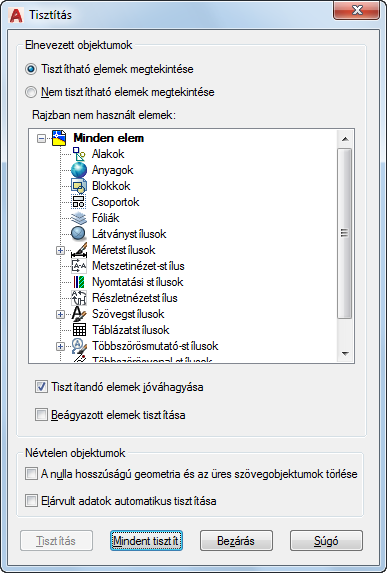 Eltávolítja a rajzból a használaton kívüli elemeket, például a blokkdefiníciókat és a fóliákat. Megjeleníti a tisztítható elemeket.