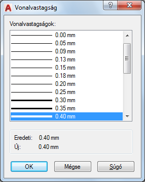 Az alkalmazható vonalvastagságok megjelenítése. A rendelkezésre álló vonalvastagságok olyan rögzített értékekből állnak, amelyek a leggyakrabban kerülnek alkalmazásra a rajzokban. Válasszon egy alkalmazni kívánt vonalvastagságot.