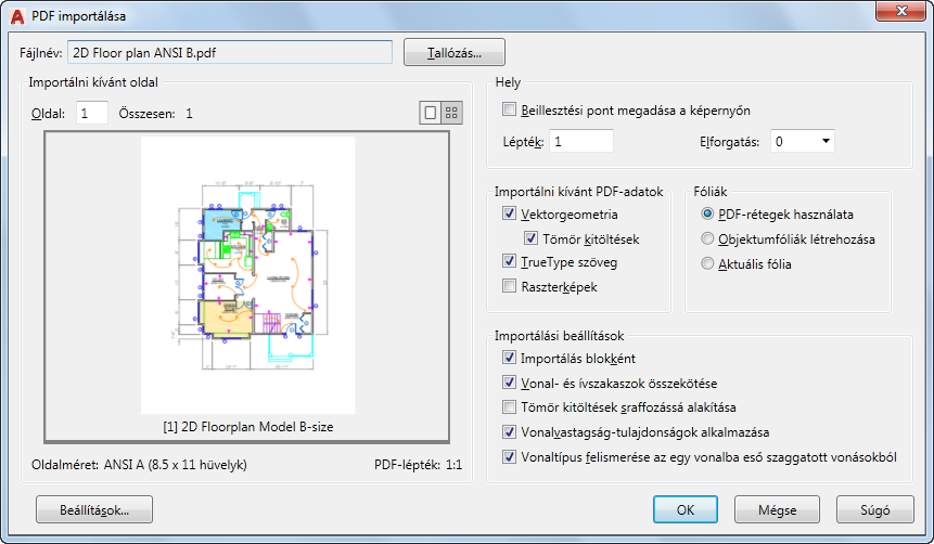 Az importált objektumokhoz megadhat más importálási mértéktényezőt. A PDF-fájlból való oldalak importálása nem használja az INSUNITS rendszerváltozó beállítását, mivel az egyes oldalak mértékegységei eltérhetnek.
