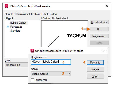 A Többszörös mutatók stíluskezelőjében kattintson az Új (1) lehetőségre, adja meg a Buborékmegjegyzés nevet új stílusnévként (2), majd kattintson a Folytatás (3) lehetőségre.