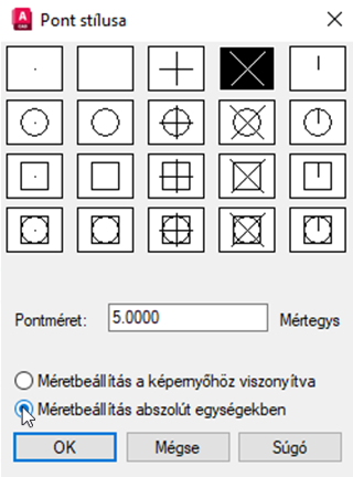 Kiválaszthatjuk, hogy a pontobjektum méretét a képernyőméret határozza-e meg, ami azt jelenti, hogy a pont mérete attól függ, hogy a pont létrehozásakor milyen mértékben nagyítottunk, vagy hogy a pontméret abszolút méretűre van-e állítva.