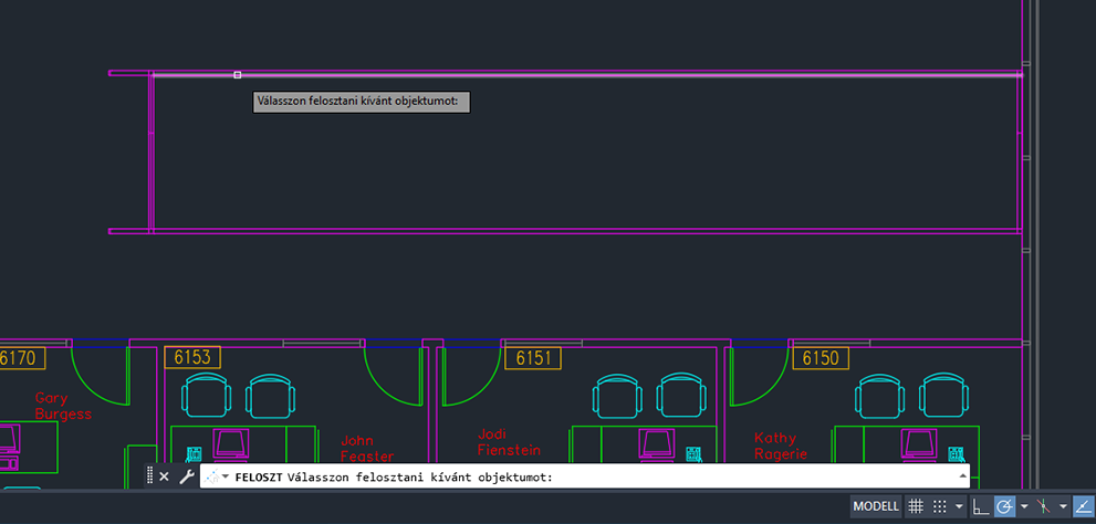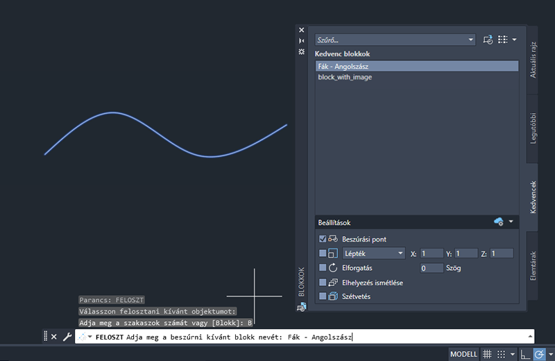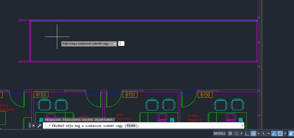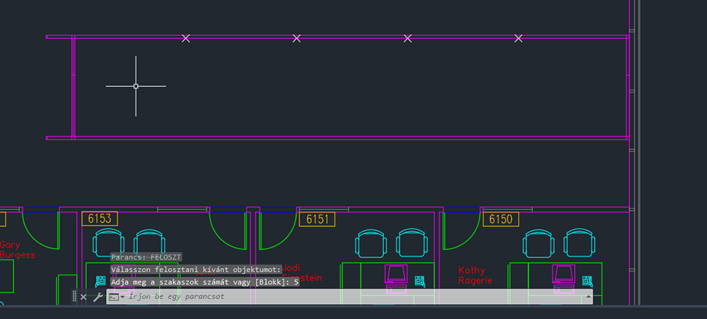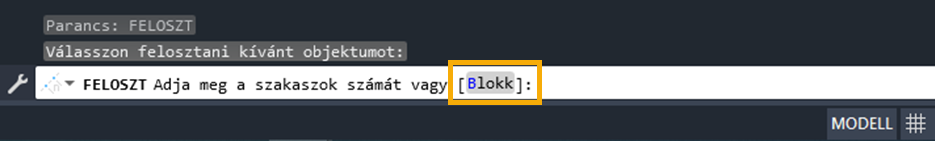 | BEOSZTÁS | Előírt hosszúságú szakaszonként pont objektumokat vagy blokkokat hoz létre egy objektum hosszán vagy kerületén. |