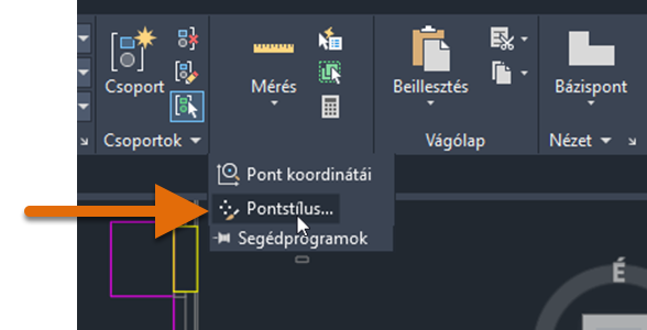 Első lépésként láthatóbbá kell tennünk az általunk létrehozott pontobjektumokat. Változtassuk meg a pontstílust a PTÍPUS paranccsal, amely a rajz összes pontobjektumának stílusát és méretét beállítja. Nem muszáj elvégeznünk ezt a lépést, de ha nem tesszük meg, akkor az általunk létrehozott pontok csak képpontnyi méretűek lesznek, amelyeket elég nehéz észrevenni.