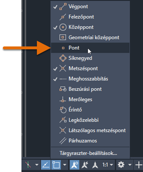 Most, hogy a pontok létre lettek hozva, arról is meg szeretnénk győződni, hogy a Pont tárgyraszter mód be van kapcsolva, hogy lekérhessük ezeket a pontokat.