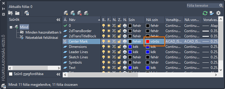 Módosítsa a Középpontjel fólia színét vörösre. Annak érdekében, hogy a színmódosítás csak ebben a nézetablakban legyen alkalmazva, válassza ki a színt az NA színe oszlopban.