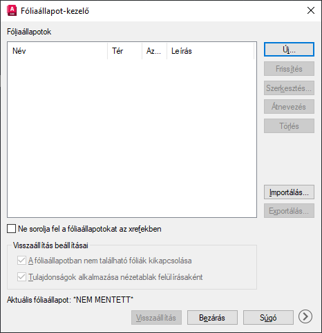 Törölje A fóliaállapotban nem található fóliák kikapcsolása jelölőnégyzet jelölését. A fóliaállapot visszaállítása nem érinti azokat a fóliákat, amelyek nem abban a rajzban voltak, ahol a fóliaállapotot létrehozták.