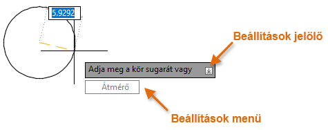Ez az ikon azt jelzi, hogy további lehetőségek érhetők el. Amikor a program a sugarat kéri, a le nyílbillentyűre kattintva vagy azt lenyomva megjelenik egy menü az Átmérő lehetőséggel. Az Átmérő lehetőséget választva a sugárérték helyett megadhatja a kör átmérőjét. Amikor megjelenik a menü, a le és a fel nyílbillentyűkkel vagy a mutatóeszközzel válthat az elérhető lehetőségek között.