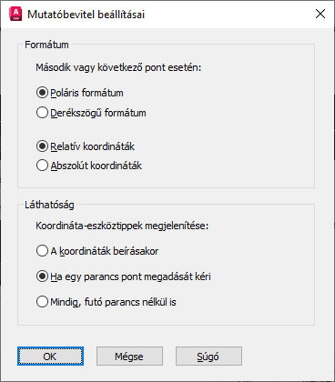 A Mutatóbevitel beállításai párbeszédpanelen vezérelheti, hogy milyen formátumban kell megadni a második vagy a következő pontot a dinamikus adatbevitel használatakor. Az alapértelmezett formátumbeállítások: Poláris formátum és Relatív koordináták. Ha a Relatív koordináták beállítást adja meg, nem kell beírnia a @ karaktert a parancsok esetében a második vagy következő koordinátaérték megadása előtt.