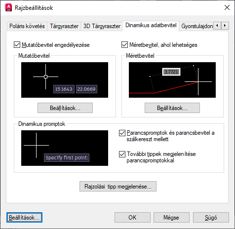 A dinamikus adatbevitel beállításai a Rajzbeállítások párbeszédpanel Dinamikus adatbevitel lapján találhatók (RAJZBEÁLL parancs). A Rajzbeállítások párbeszédpanel Dinamikus adatbevitel lapját a következők valamelyikének végrehajtásával jelenítheti meg: