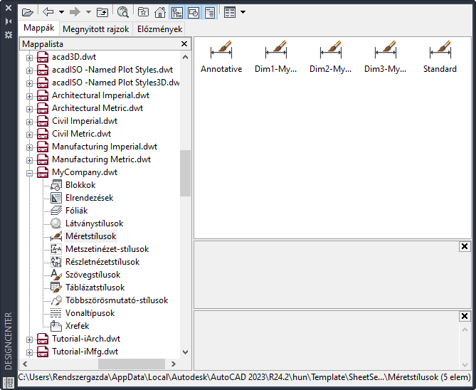Tegyük fel, hogy importálni kíván néhány méret-, szöveg- és táblázatstílust a frissített vállalati sablonból. Ezek a stílusok a rajz létrehozása után kerültek a sablonba, így nem lettek beolvasva abból. Ebben a példában a DesignCenter használatával importálunk néhány stílust.