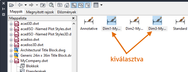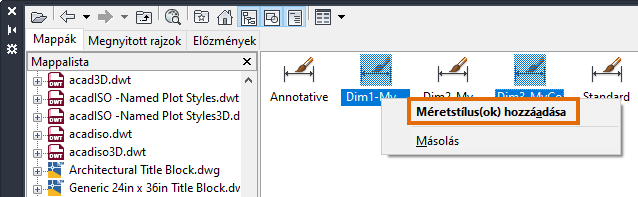 Megjelennek a rajzban vagy a sablonban definiált méretstílusok.