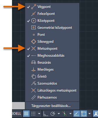 Kattintson a jobb gombbal a Tárgyraszter gombra, és jelölje be a Végpont és a Metszéspont is lehetőséget, ha még nincsenek bejelölve.