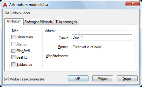 Ez az opció azt vezérli, hogy a frissített rajzterületen megjelenjenek-e a látható attribútumváltoztatások. Ha a Módosítások előnézete opció be van jelölve, a változtatások rögtön láthatóvá válnak. Ha a Módosítások előnézete opció nincs bejelölve, a változtatások nem lesznek láthatóak.
