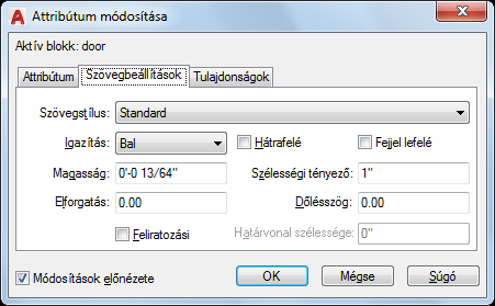 Beállítja azokat a tulajdonságokat, amelyek meghatározzák az attribútum szövegének a rajzban való megjelenését. Az attribútum szövegének színe a Tulajdonságok lapon állítható be.
