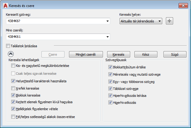 Például, ha sok hasonló alkatrész van a rajzban, de mindegyiket 4384K61-re kell cserélnie, akkor adja meg a 4384K6? értéket a Keresett szöveg mezőben, és a 4384K61 értéket a Csere mezőben.