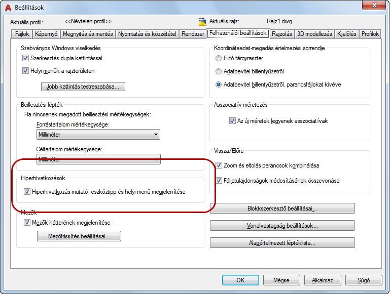 A Beállítások párbeszédpanel Felhasználói beállítások lapján engedélyezze a hiperhivatkozás adatainak megjelenítését.