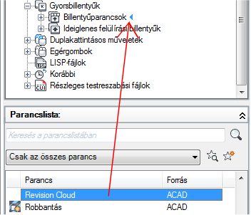 Billentyűparancs létrehozásához a Parancslista területről húzzon át egy parancsot a <fájlnév> testreszabási beállításai terület Billentyűparancsok csomópontjába.