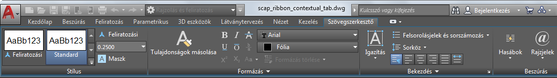 Bizonyos objektumtípusok kijelölésekor vagy egyes parancsok elindításakor egy környezetfüggő szalaglap jelenik meg az eszköztár vagy a párbeszédpanel helyett. A parancs befejezését követően a környezetfüggő lap bezárul.