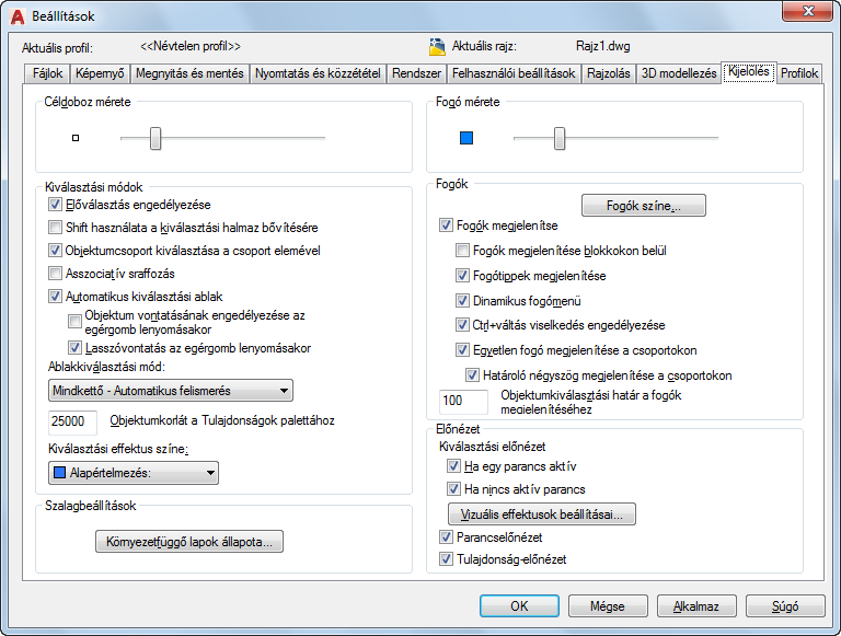 A kiemelés előnézetét csak akkor jeleníti meg, ha nincs aktív parancs. (SELECTIONPREVIEW rendszerváltozó)