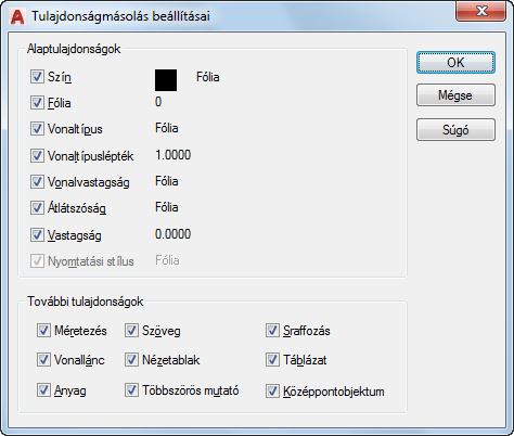 Az objektumok alaptulajdonságai mellett a célobjektum sraffozási tulajdonságait (beleértve a feliratozási tulajdonságokat is) a forrásobjektum sraffozási tulajdonságaira változtatja. A sraffozás kezdőpontjához történő igazításhoz használja a Tulajdonságok öröklése opciót (SRAFFOZ vagy SRAFFEDIT parancs). Csak sraffozási objektumok esetén használható.