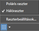 | Keres | Raszter mód | Bekapcsolja a háló típusú rasztert. Amikor a hálóraszterek vannak be kapcsolva, a mutató mozgatása során a mutató a megadott hálóintervallumokra illeszkedik. Amikor a poláris raszterek vannak be kapcsolva, a mutató a megadott távolságokra illeszkedik a megadott poláris illesztési útvonalak mentén. |