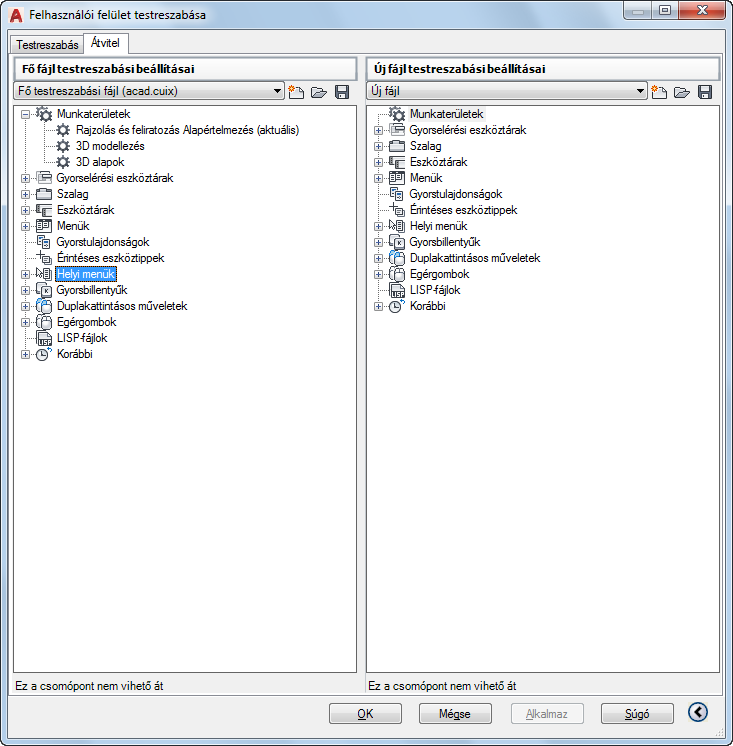 Ha beírja a CUIIMPORT parancsot a parancspromptba, a fő CUIx-fájl (AutoCAD fájlok esetén alapértelmezés szerint az acad.cuix, AutoCAD LT fájlok esetén pedig az acadlt.cuix) megjelenik a jobb oldali panelen. A bal oldali panelen megnyithat egy CUIx- vagy korábbi testreszabási fájlt az adatok átviteléhez. Ha a CUIEXPORT parancsot írja be a parancspromptba, a fő CUIx-fájl a bal oldali panelen jelenik meg. A jobb oldali panelen megnyithat egy másik CUIx- vagy korábbi testreszabási fájlt az adatok átviteléhez.