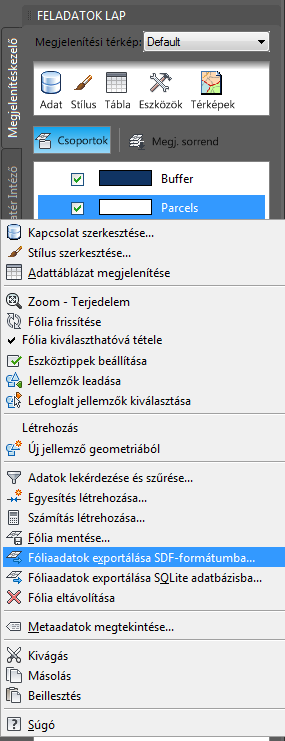 Az exportáláshoz kattintson a jobb gombbal a Telkek fóliára.