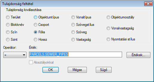 A tulajdonság feltételeként válassza a Fólia lehetőséget. Csak a meghatározott fóliákon szereplő objektumok kerülnek a térképre.