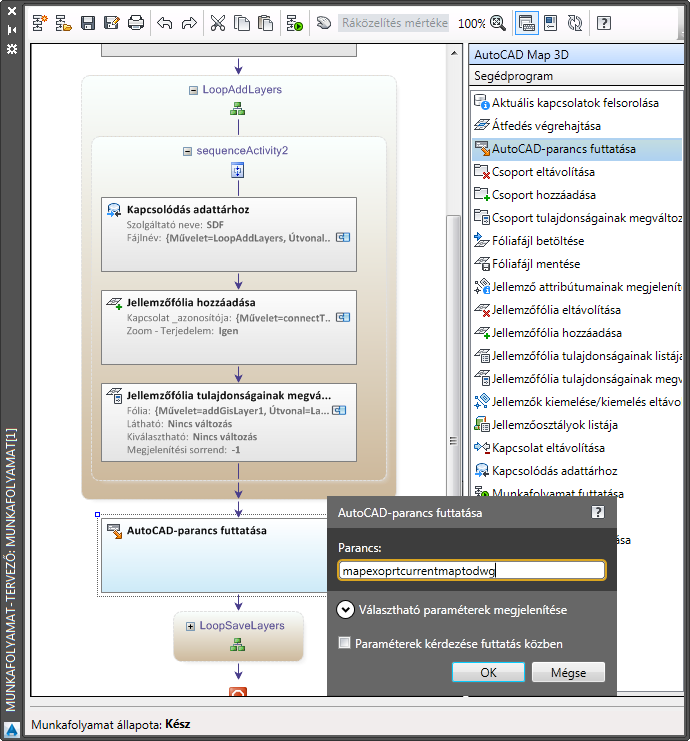 Húzza az AutoCAD-parancs futtatása műveletet a LoopSaveLayers művelet elé. Billentyűzze be a parancs nevét.