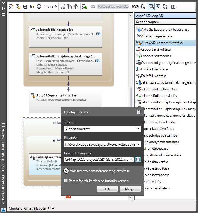 A művelet az aktuális térképben található fóliákat .layer fájlokként menti a megadott mappában