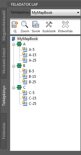 A térképkönyv létrehozásakor a szelvények a Feladatok lapon szerepelnek, és egy elrendezés lap jelenik meg mindegyik szelvényhez.