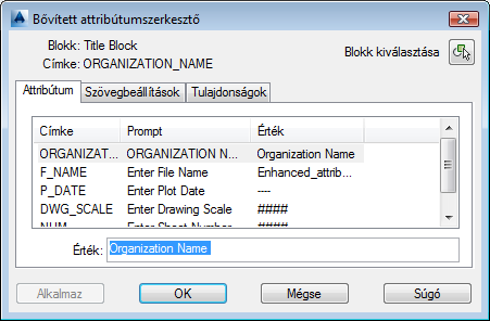 A címpecsét definíció tulajdonságai meghatározzák a szövegét és a megjelenését. Módosíthatja ezen tulajdonságok értékeit. Megadhatja például a határvonalak megjelenését vagy a blokk szöveg változóinak értékét.