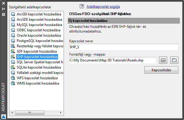 - Kattintson a Kapcsolódás gombra az Utak SHP-fájl adatforrásként való hozzáadásához.