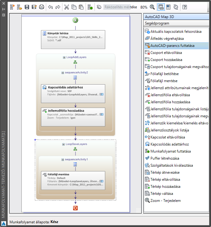Ebben az esetben a program a ForEach műveletnek a „LoopAddLayers” nevet adta, hogy leírja annak működését. A művelet megvizsgálja a Könyvtár tartalmának megjelenítése műveletben megjelölt mappa összes SDF-fájlját. Minden ismétlődés esetén csatlakozik egy SDF-fájlhoz, és hozzáad egy jellemzőfóliát a Megjelenítéskezelőhöz.